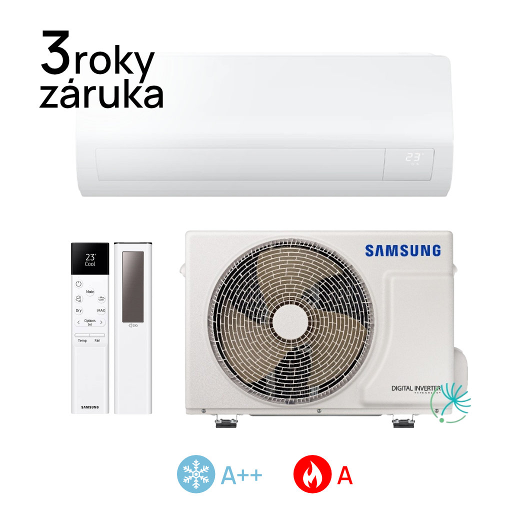 Tichý provoz – od 19 dB(A). AI Auto Comfort – automatická optimalizace režimu na základě analýzy okolního prostředí. Rychlé chlazení – chladí rychleji a do všech směrů i větších prostor. SmartThings – Wi-Fi vzdálená kontrola kdykoli a odkudkoli. Auto Clean – klimatizace se sama automaticky vyčistí. Easy Filter. Plus – antibakteriální filtr, který se snadno čistí. DuraFin™ Plus – předchází korozi, pro klimatizaci s dlouhou životností. Chladivo R32 – chladivo šetrné k životnímu prostředí. ECO Mode – efektivní chlazení, snížená spotřeba energie, nižší náklady. Good Sleep – režim kontrolující teplotu místnosti pro zajištění dobrého spánku. Infračervený solární ovladač v balení