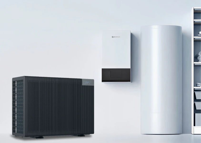 Sestava tepelného čerpadla ERA PRO a vnitřní jednotky DHWU 9, s vestavěnnou TUV nádrží. Je optimální varianta pro novostavby rodinných domu tak i rekonstrukcí, zejména s důrazem na malý instalační prostor a úsporu místa.